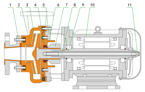1 進(jìn)口接管 3 葉輪 5 支架 7 機(jī)械密封 9 電機(jī)軸 11 穿軸螺母